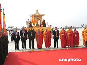 此前,從早晨九時(shí)半時(shí)開(kāi)始,在機(jī)場(chǎng)停機(jī)坪舉行了一個(gè)約三十分鐘的恭送儀式。參加的人士有中國(guó)佛教協(xié)會(huì)會(huì)長(zhǎng)、內(nèi)地恭送團(tuán)團(tuán)長(zhǎng)一誠(chéng)法師;中國(guó)佛教協(xié)會(huì)副會(huì)長(zhǎng)圣輝法師;香港佛教聯(lián)合會(huì)會(huì)長(zhǎng)、香港迎請(qǐng)團(tuán)團(tuán)長(zhǎng)覺(jué)光法師;中國(guó)國(guó)家宗教事務(wù)局副局長(zhǎng)楊同祥、陜西省副省長(zhǎng)張偉等,總?cè)藬?shù)為八百多人。
