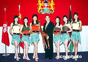 13至18號候選港姐獲頒贈紀念品。十八位港姐候選佳麗將于29日前赴東非肯尼亞拍攝外景,5月25日出席肯尼亞旅游局舉行之記者會,肯尼亞駐港澳名譽領事兼旅游局(遠東區(qū))專員譚榮根博士向13至18號候選佳麗(右起)頒贈富有肯尼亞特色的紀念品,并祈求外景拍攝順利。作者:鄧慶樂