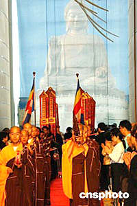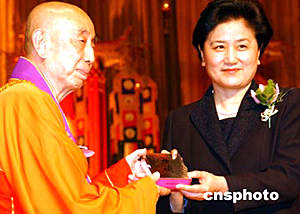 國家宗教局局長葉小文、中國佛教協(xié)會會長一誠法師,五月二十六日在香港會展中心舉行的香港佛教暨各界迎請佛指舍利瞻禮祈福大會儀式上,向香港特首董建華贈(zèng)送紀(jì)念品。 作者:錢興強(qiáng)