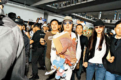 張赫戴上帽,身穿白衫白褲;全智賢則穿黑褸和牛仔褲,在昨午1時30分抵港,電影公司聘請了廿多位保安在機場護(hù)送兩人,但當(dāng)他們出閘時,熱情Fans一擁而上,更突破了防線,令場面變得混亂;靵y中,張赫的Fans欲送鮮花給偶像,但卻錯手擊中全智賢的頭部,“中頭獎”的全智賢用手摸頭頂呼痛,之后一度黑口黑臉。