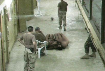在其中一張照片中,一個美國士兵用膝蓋狠狠頂住囚犯的頸部,而這個囚犯已經(jīng)在地板上縮成一團。不愿透露姓名的人士告訴NBC說,照片中有些人是美國軍事情報部門的官員,其中一個據(jù)信是情報官員的男子正在朝囚犯身上扔擲某種無法辨認的物體。