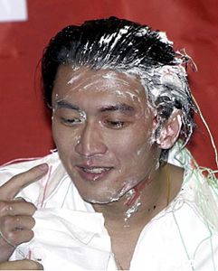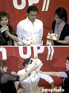 五月二十九日晚,在美卡音像為謝霆鋒新專輯《LISTEN UP》熱賣舉行的慶功會(huì)上,謝霆鋒毫無防備被工作人員準(zhǔn)備的雙份蛋糕“擊中”全臉,頓失俊朗形象。中新社記者:高遠(yuǎn)