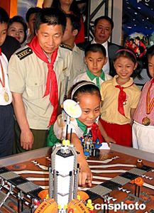 六月一日,一位小航天迷在北京中國兒童中心向航天飛行員楊利偉介紹機(jī)器人火星探險車。當(dāng)天,楊利偉在孩子們的簇?fù)硐鲁鱿艘浴皩W(xué)習(xí)科學(xué)文化知識,發(fā)展祖國航天事業(yè)”為主題的兒童科技活動,與孩子們一起歡度“六一”。中新社記者:王歡