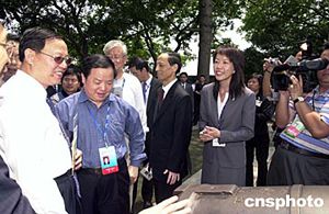 代表團成員香港政務(wù)司司長曾蔭權(quán)與澳門社會文化司司長崔世安在參觀澳門旅游塔時合影。作者:梁永強  當(dāng)天上午代表團參觀著名的大炮臺。作者:梁永強