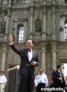 香港政務(wù)司司長曾蔭權(quán)在參觀大三巴時向圍觀的澳門市民揮手致意。作者:梁永強