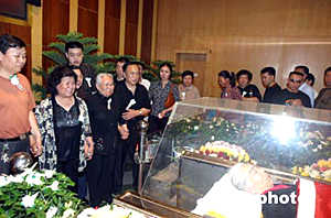在鄭州市殯儀館內(nèi),記者看到,躺在鮮花叢中的常老是那樣的安詳。鮮花簇?fù)淼撵`柩上,覆蓋著一面鮮紅的中共黨旗。靈柩上方,黑紗環(huán)繞著常香玉的照片——花白頭發(fā),寬邊眼鏡,大紅毛衣外罩,端莊慈祥寧?kù)o的笑容,一派優(yōu)雅。雖然其親屬根據(jù)常老的遺愿盡量使儀式簡(jiǎn)樸,然而前往吊唁的各界人士一度達(dá)到幾千人,整個(gè)儀式大廳被圍了個(gè)水泄不通。