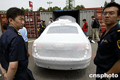 六月六日,參加二零零四年北京國(guó)際汽車展覽會(huì)的車輛陸續(xù)運(yùn)抵北京國(guó)際展覽中心。海關(guān)人員開始對(duì)參展汽車進(jìn)行逐一檢查。圖為參展車輛奧迪A8等待海關(guān)人員檢查。中新社記者:盛佳鵬