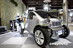 六月七日,一名工作人員在北京國(guó)際展覽中心展臺(tái)上布置一款新型的JEEP概念車(chē)。二零零四年北京國(guó)際汽車(chē)展覽會(huì)將于二零零四年六月十日至十六日在中國(guó)國(guó)際展覽中心和全國(guó)農(nóng)業(yè)展覽館舉行。中新社記者:盛佳鵬