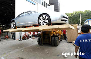 圖為工作人員正忙著將一款東風(fēng)雪鐵龍新型跑車(chē)運(yùn)進(jìn)展廳。中新社記者:盛佳鵬