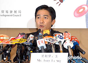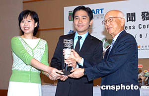 影帝梁朝偉6月8日在香港出席《第八屆香港國際影視展》新聞發(fā)布會(huì),并獲委任為「2004年度香港影視娛樂大使」,香港貿(mào)發(fā)局影視娛樂業(yè)咨詢委員會(huì)主席鄒文懷(右),及貿(mào)發(fā)局服務(wù)業(yè)拓展總監(jiān)陳嘉怡(左)攜手將紀(jì)念品贈(zèng)予梁朝偉。作者:鄧慶樂