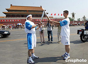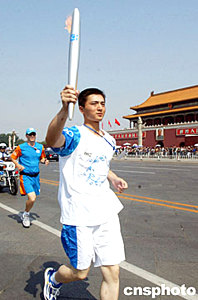 在火炬點(diǎn)燃后,在148名火炬手中第一個出場的國家體育總局副局長、中國奧委會副主席、北京奧組委副主席于再清接過火炬,開始了這次傳遞活動。據(jù)悉,NBA休斯頓火箭隊中鋒姚明擔(dān)當(dāng)最后一棒。