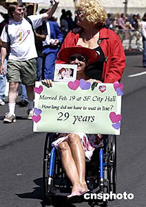美西圣荷西市六月十三日舉行第二十九屆同性戀游行,一對相戀二十九年、今年二月十九日在加州舊金山市政府登記結(jié)婚的同性伴侶參加游行,F(xiàn)在,舊金山和圣荷西市所在的加利福尼亞州法院尚未批準同性婚姻合法。作者:陳鋼