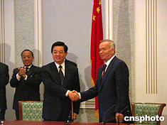 中新社塔什干六月十五日電(記者 李鵬)正在烏茲別克斯坦進(jìn)行國(guó)事訪問(wèn)的胡錦濤當(dāng)?shù)貢r(shí)間十五日上午與烏總統(tǒng)卡里莫夫簽署中烏聯(lián)合聲明,進(jìn)一步發(fā)展與加深兩國(guó)友好合作伙伴關(guān)系。