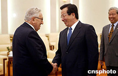 中國(guó)國(guó)家副主席曾慶紅六月十五日在北京人民大會(huì)堂會(huì)見前來出席“和平共處五項(xiàng)原則國(guó)際研討會(huì)”的美國(guó)前國(guó)務(wù)卿基辛格。中新社記者:毛建軍