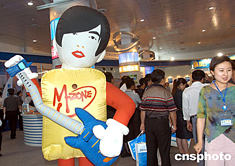 APEC在電子商務(wù)領(lǐng)域舉辦的首次重大經(jīng)貿(mào)活動“APEC電子商務(wù)博覽會”,六月十五日至十九日在中國海濱城市煙臺舉行,以臺灣歌手周杰倫為形象的充氣人出現(xiàn)在本次商覽會主展覽上。中新社記者:張宇