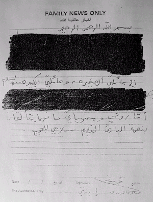 信的開頭寫道:“以慈悲的神的名義”,接下來有6行字被劃掉,再往下是“向我的小家庭和大家庭問好”,下面又有3行字被劃掉,接下來的文字是“感謝老天,我的精神很好,我的士氣很高。向所有人問好!。這封信經(jīng)過了駐伊美軍的嚴(yán)格審查,其實(shí)際內(nèi)容基本已經(jīng)不存在。魯沙旦說:“三分之二的內(nèi)容被劃掉了,只剩下17個(gè)字,根本無法理解其原意!(章田)