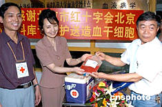 六月二十二日晚,中國造血干細胞捐獻者資料庫北京管理中心主任金輝(中)福建醫(yī)科大學附屬協(xié)和醫(yī)院主任醫(yī)師陳志哲(右)移交北京首例在校大學生骨髓捐獻者造血干細胞,以緊急用于該院福建十三歲少年謝輝骨髓移植手術。作者:劉可耕