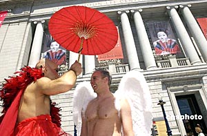 六月二十七日,美國舊金山市舉行第三十四屆同性戀游行。圖為一對打扮“香艷”的男子參加游行。 作者:陳鋼
