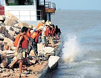 新華社的圖片報(bào)道顯示,施工人員近日在武漢江段武青干堤施工現(xiàn)場(chǎng)向水中拋石。