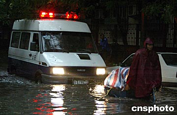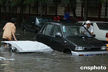 中新網7月10日電(記者 聞育旻) 10日下午4時許,北京上空電閃雷鳴,突遭瓢潑大雨,北京城區(qū)部分街道水深及膝蓋,部分車輛因發(fā)動機進水而癱瘓于路中,城區(qū)交通嚴重擁堵。