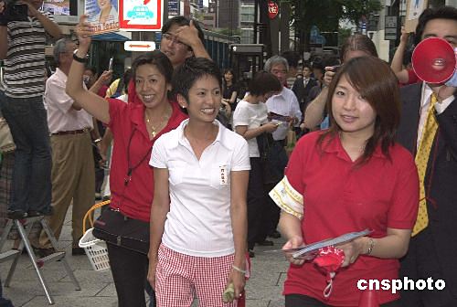 日本第二十屆參議院選舉七月十一日結(jié)束投票,并于十二日凌晨公布全部統(tǒng)計結(jié)果。擁有一半中國血統(tǒng)的日本知名電視主持人蓮舫當選為參議員。蓮舫是日本民主黨推薦的候選人,她在東京選區(qū)的競選中獲勝,這也是日本國會中首次出現(xiàn)華裔議員。圖為蓮舫(圖中白衣者)在日前的街頭選舉活動中。作者:王健