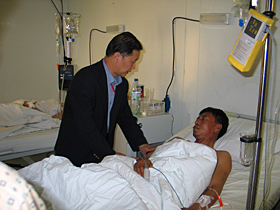 昆都士距喀布爾雖僅有三百多公里,但由于道路遭多年戰(zhàn)爭破壞,陸路要走八個小時。孫大使、徐武官和馬斗馳武官助理一行三人于上午10時登上聯(lián)合國僅有十幾個座位的小飛機,11時10分抵達。這起重大恐怖襲擊事件震驚了世界,也牽動了黨和國家領導人的心。孫大使臨赴工地前已得到胡錦濤主席、吳邦國委員長和溫家寶總理的指示,要求大使館全力搶救受傷同胞,妥善處理善后事宜。
