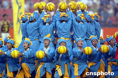 七月十七日晚,二零零四年亞洲杯足球賽開幕式在北京工人體育場舉行,在開幕式上中國兒童表演蹴鞠。蹴鞠被認為是足球的始祖。中新社記者:盛佳鵬