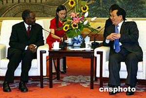 二○○四年七月二十一日,中國(guó)國(guó)家副主席曾慶紅(右)在北京會(huì)見盧旺達(dá)外長(zhǎng)穆里甘德(左)一行。中新社記者:鄭萍萍