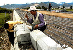 二○○四年七月下旬,筑路工人在西藏拉薩近郊青藏鐵路第三十一標段鋪設(shè)路基、加固擋土墻,作鋪軌前的準備。據(jù)專家理論預測,青藏鐵路開通后,到西藏旅游的人數(shù)將逐年增加一百萬人次以上。作者:王麗南