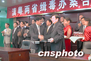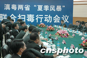 七月二十三日下午,滇粵兩省在昆明舉行“夏季風(fēng)暴”聯(lián)合掃毒行動(dòng)會(huì)議。由廣東省委副書記王華元及副省長(zhǎng)李容根率領(lǐng)的廣東禁毒代表團(tuán),與中共云南省委常委李明朝、副省長(zhǎng)李漢柏等就雙方建立合作機(jī)制進(jìn)行了深入的探討。兩省警方負(fù)責(zé)人還共同簽署了《滇粵兩省公安機(jī)關(guān)聯(lián)合開展打擊跨區(qū)域毒品犯罪專項(xiàng)行動(dòng)方案》和《滇粵兩省公安機(jī)關(guān)全面加強(qiáng)緝毒辦案合作協(xié)議》。此舉標(biāo)志著兩省禁毒合作新機(jī)制的全面啟動(dòng)。按照協(xié)議,兩省將全面加大緝毒情報(bào)交流和辦案執(zhí)法合作力度,組織偵破一批高質(zhì)量、跨區(qū)域、有組織的制販毒案件并將建立若干合作機(jī)制。王華元表示,為加強(qiáng)禁毒工作,廣東省將于近期成立禁毒工作局,增加禁毒力量,并將在各地成立禁毒支隊(duì)。與此同時(shí),還將動(dòng)員全社會(huì)的力量嚴(yán)厲打擊毒品犯罪活動(dòng)。中新社納家驊/攝