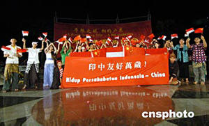 一百多名來自美國(guó)、英國(guó)、委內(nèi)瑞拉、巴西、馬來西亞、印尼、緬甸等七個(gè)國(guó)家和香港、澳門特別行政區(qū)的華裔青年,二十五日晚在廣州華南師大與廣州青年歡聚一堂。印尼華裔青年在聯(lián)歡會(huì)上表演節(jié)目。作者:羅仰明