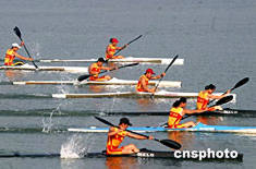 中國國家皮劃艇隊女子皮艇運動員七月二十七日在山東日照水庫訓練基地進行奧運賽前模擬實戰(zhàn)訓練,備戰(zhàn)雅典奧運會。作者:張勤