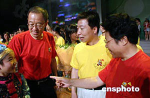 七月二十九日晚,中國首飛太空航天員楊利偉(右二)在北京奧林匹克體育館出席了《中國尋根之旅夏令營》聯(lián)歡晚會,與會的中外青少年與他們心目中的英雄零距離接觸感到十分高興。中新社記者:史利