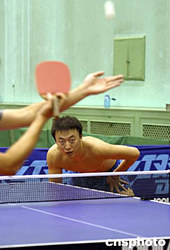 七月三十日,中國(guó)國(guó)家乒乓球隊(duì)主力隊(duì)員馬琳正在河北正定乒乓球訓(xùn)練基地赤膊上陣,刻苦訓(xùn)練。中新社記者:張勤