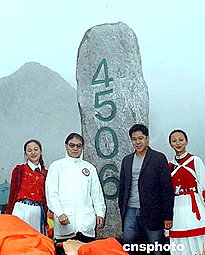 香港奧委會(huì)主席霍震霆及公子,8月1日在云南麗江游覽玉龍雪山,在海拔4506高度標(biāo)志前留影。作者:洪少葵