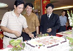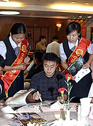 八月一日晚,秦皇島市人民政府,中信實(shí)業(yè)銀行,中國移動(dòng)通信集團(tuán)在海濱城市秦皇島為即將奔赴雅典的國家乒乓球隊(duì)領(lǐng)導(dǎo)和運(yùn)動(dòng)員舉行壯行酒會(huì)。中新社記者:張勤