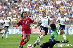 當(dāng)?shù)貢r(shí)間八月一日下午,中國國家女子足球隊(duì)在美國康州州立大學(xué)橄欖球場(chǎng)與美國女足進(jìn)行友誼比賽,以一比三負(fù)于美國女足。這是中國女足奔赴雅典奧運(yùn)會(huì)前的最后一場(chǎng)熱身賽,中國女足將于八月五日前往雅典。作者:陳鋼
