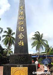 二○○四年七月下旬,在海南興隆華僑農(nóng)場(chǎng)的亞洲熱帶風(fēng)情園里,豎立著兩尊黑色金字的柱子。據(jù)悉,它們是香港與澳門回歸紀(jì)念柱,這兩尊柱子是該風(fēng)情園的一大景觀。作者:顧時(shí)宏