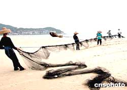 二○○四年六月一日至八月一日是廣東實(shí)施伏季休漁的第六個(gè)年頭,南海海域伏季休漁期間,共有一萬(wàn)多艘漁船、十萬(wàn)多漁民休漁。圖為廣東陽(yáng)江漁民在下網(wǎng)捕魚。作者:劉衛(wèi)勇