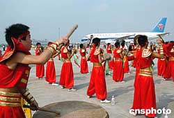 廣州新白云國際機場遷建落成慶典二○○四年八月二日在新機場停機坪舉行。一架空中客車在新機場降落并停在慶典會場,一百二十名新機場的建設者手棒鮮花走下飛機走向會場參加落成慶典。作者:羅仰明