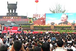二○○四年八月三日下午,紀(jì)念鄧小平誕辰一百周年大型歌會在小平故鄉(xiāng)四川廣安舉行,宋祖英、張明敏、藏天朔、扮演鄧小平的演員盧奇等參加文藝表演。圖為大型歌會現(xiàn)場。作者:郭晉嘉