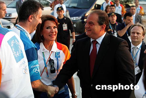 當(dāng)?shù)貢r(shí)間8月3日晚,希臘總理在組委會(huì)要員陪同下視察雅典奧運(yùn)會(huì)賽場(chǎng),并慰問(wèn)志愿服務(wù)者。中新社記者:任晨鳴