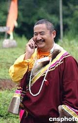 云南麗江古城文筆山文峰寺的喇嘛,使用新款手機(jī)與外界聯(lián)系,文峰寺是文物重點(diǎn)保護(hù)單位,在當(dāng)?shù)孛癖娭杏谐绺叩牡匚。作?洪少葵