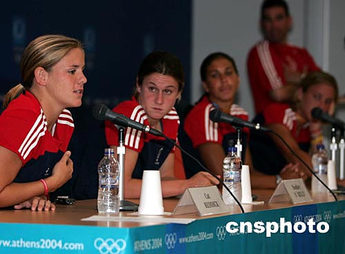 雅典奧運(yùn)會(huì)女足金牌大熱門(mén)美國(guó)的四名隊(duì)員,當(dāng)?shù)貢r(shí)間8月5日下午在雅典奧運(yùn)會(huì)新聞發(fā)布會(huì)亮相,后衛(wèi)隊(duì)員CAT REDDICK強(qiáng)調(diào):奪取本屆奧運(yùn)會(huì)的女足金牌并不是唯一的目的,參加奧運(yùn)會(huì)本身就令人激動(dòng)不已。中新社記者:任晨鳴