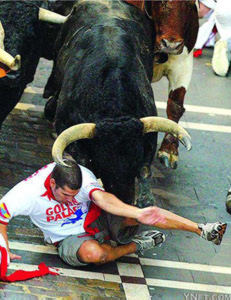 下午,上午在街頭狂奔的斗牛將與勇敢的斗牛士再次激戰(zhàn)。盡管每年的奔牛節(jié)活動(dòng)上都會(huì)有人受傷甚至喪命,但西班牙男人仍然樂(lè)此不疲。