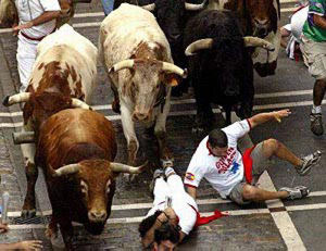 在西班牙的斗;顒(dòng)中,旁普羅納鎮(zhèn)舉辦的奔牛節(jié)是一個(gè)高潮。該項(xiàng)活動(dòng)起始于1850年,在每年的7月6日至7月14日期間舉行,每天一大早,成群的斗牛從柵欄中被放出,而大街上數(shù)以千計(jì)穿著旁普羅納傳統(tǒng)服裝的年輕男人和觀光客則冒著被牛只沖撞和踩踏的危險(xiǎn)開(kāi)始在牛群前拼命奔跑,要跑一公里長(zhǎng)的路,一直跑到賽牛場(chǎng)才停止。