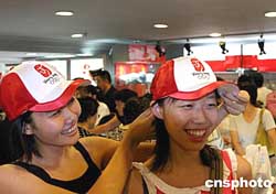 八月六日,北京兩名大學(xué)生專程來到北京王府井工藝美術(shù)商店的奧運(yùn)特許商品零售專柜前購買自己喜愛的奧運(yùn)棒球帽,剛剛開業(yè)第二天的王府井工藝美術(shù)商店奧運(yùn)特許商品零售專柜前擠滿了前來購買奧運(yùn)紀(jì)念品的市民。中新社記者:張勤