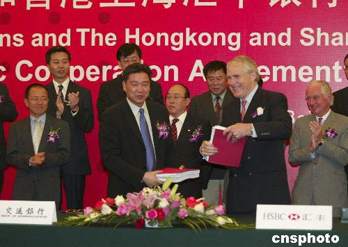 中新社北京八月六日電(記者李鵬)中國最大的股份制商業(yè)銀行交通銀行六日與香港上海匯豐銀行在北京簽署戰(zhàn)略合作協(xié)議。匯豐銀行以現(xiàn)金入股交通銀行,入股比例為百分之十九點九,接近銀監(jiān)會規(guī)定的百分之二十上限,這是迄今為止國際著名金融機(jī)構(gòu)入股中國商業(yè)銀行的最大宗交易。