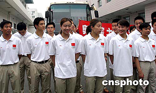 8月8日,中國奧運(yùn)軍團(tuán)從北京出征2004雅典奧運(yùn)會(huì),中國跳水隊(duì)在北京集合準(zhǔn)備出發(fā)奔赴雅典奧運(yùn)會(huì)賽場。中新社記者:盛佳鵬