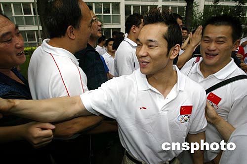 8月8日,中國(guó)奧運(yùn)軍團(tuán)齊聚北京出征2004雅典奧運(yùn)會(huì),中國(guó)舉重隊(duì)隊(duì)員樂(lè)茂盛(右二)和張國(guó)政(右一)在中國(guó)國(guó)家體育總局訓(xùn)練局和隊(duì)友話別。中新社記者:盛佳鵬